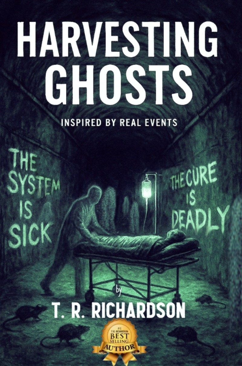 “Harvesting Ghosts by #1 Best Selling Author, T.R. Richardson, exposes bodies and secrets beneath a small-town hospital. Inspired by real events, this medical thriller reveals hidden tunnels where institutions trade lives as currency under the guise of care.”